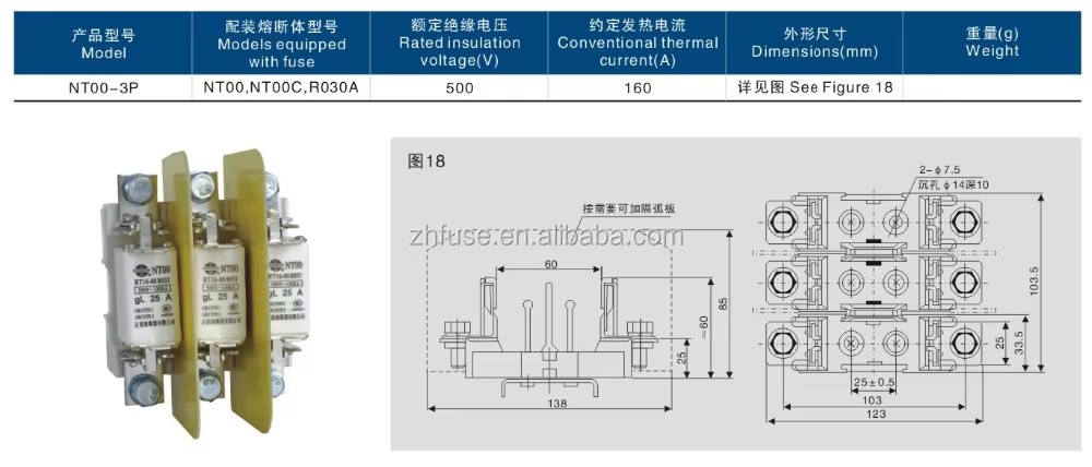 ఈ ఫ్యూజ్ల శ్రేణిలో ఫ్యూజ్ లింక్ మరియు ఫ్యూజ్ హోల్డర్ ఉంటాయి. NT00-3P ఫ్యూజ్ బేస్ హై-బలం సిరామిక్ ఫ్లోరింగ్ లేదా హై-టెంపరేచర్ రెసిన్ ఫ్లోరింగ్తో తయారు చేయబడింది, చీలిక ఆకారపు మిశ్రమ స్టాటిక్ పరిచయాలతో. ఇది మంచి వేడి వెదజల్లడం, అధిక యాంత్రిక బలం, నమ్మదగిన కనెక్షన్ మరియు సులభమైన ఆపరేషన్ కలిగిన బహిరంగ నిర్మాణం. NT00-3P ఫ్యూజ్ బేస్ ఈ సిరీస్తో అనుకూలంగా ఉంటుంది మరియు NH ఫ్యూజ్ పుల్లర్ బేస్ నుండి ఫ్యూజ్ను తొలగించడానికి ఉపయోగించబడుతుంది. స్వచ్ఛమైన రాగి లేదా వెండి షీట్ (లేదా సిల్వర్ వైర్) తో చేసిన ఫ్యూజ్ లింక్ అధిక బలం సిరామిక్తో చేసిన కరిగే గొట్టంలో మూసివేయబడుతుంది.