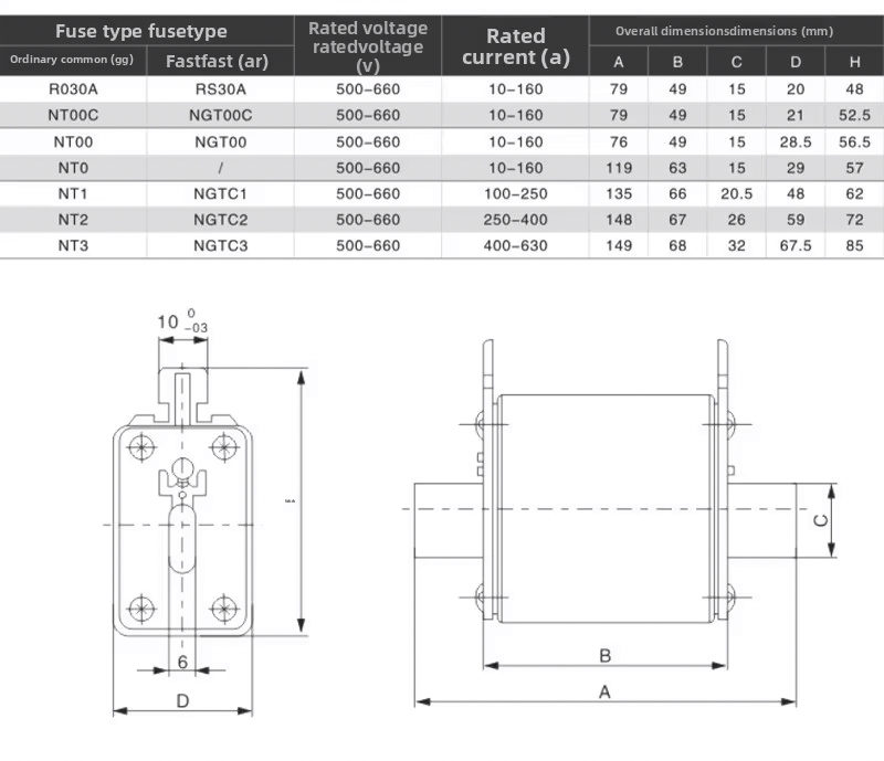 NT/NH బ్లేడ్ రకం ఫ్యూజ్-లింక్లు aM క్లాస్ మోటారు రక్షణ కోసం ఉంటాయి.ఈ అధిక బ్రేకింగ్ కెపాసిటీ ఫ్యూజ్-లింక్లు అధిక ఇన్రష్ కరెంట్తో మోటార్లు, ట్రాన్స్ఫార్మర్ మరియు ఇతర లోడ్లలో షార్ట్ సర్క్యూట్ రక్షణ కోసం ఉద్దేశించబడ్డాయి. టాప్ ఎండ్లో స్టాండర్డ్ విజువల్ ఇండికేటర్ మరియు ముందు వైపు ఐచ్ఛికం ఉంది. ఈ సిరీస్ ఫ్యూజ్లు పరిమాణం NH000 నుండి NH4 వరకు ఫ్యూజ్లను కలిగి ఉంటాయి, 1250A వరకు రేట్ చేయబడిన కరెంట్లు, 690V వరకు వోల్టేజ్ రేట్ చేయబడతాయి.