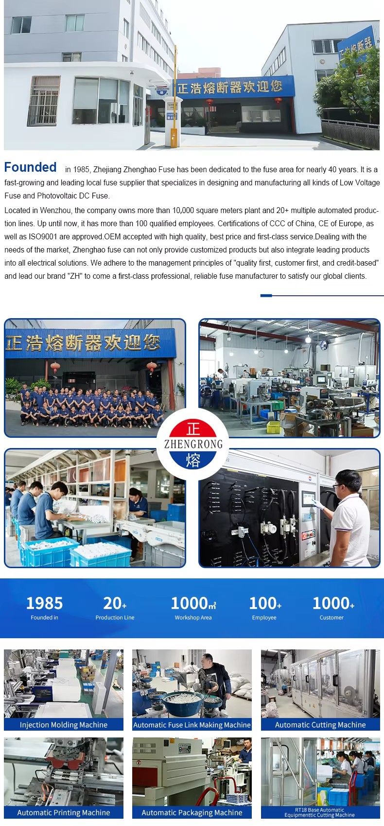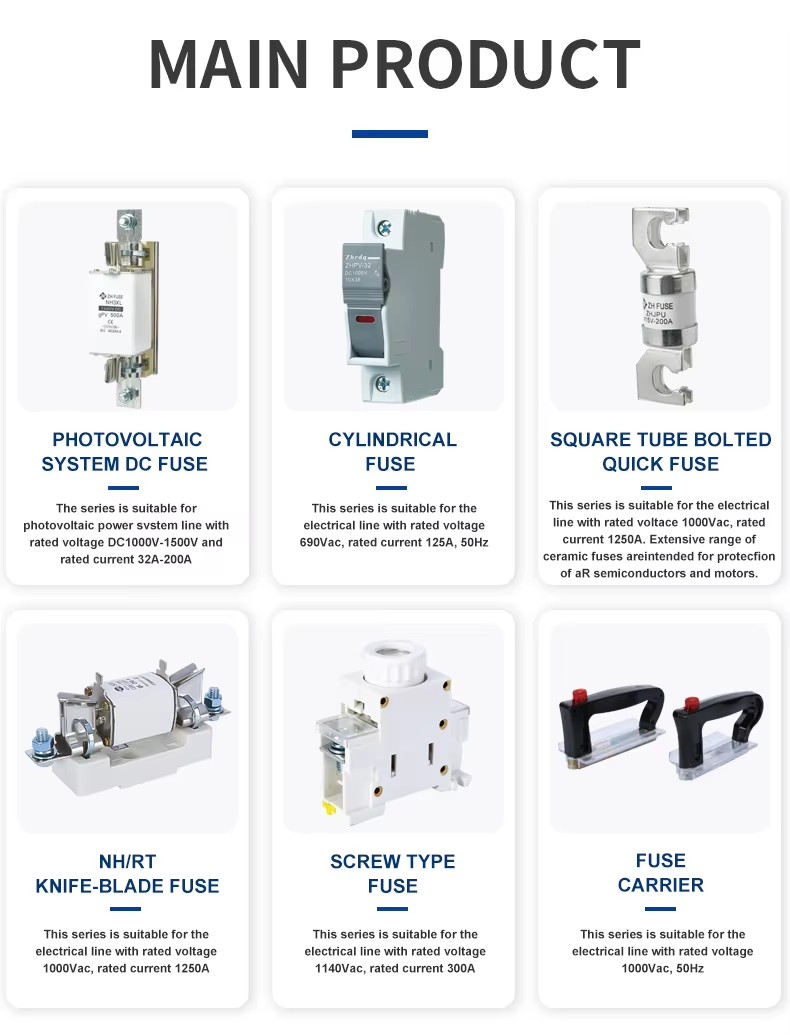 ZHPV-125 1000V DC ఫ్యూజ్ బేస్ మరియు ఫ్యూజ్ లింకులు యొక్క నిర్మాణ లక్షణాలు 22 × 58 మిమీ స్థూపాకార సిరామిక్ ఫ్యూజ్ దిగువ ఫోటోవోల్టాయిక్ వ్యవస్థలో ఉన్నాయి. ఈ ఫ్యూజ్ల శ్రేణిలో ఫ్యూజ్ లింక్ మరియు ఫ్యూజ్ హోల్డర్ ఉంటాయి. స్వచ్ఛమైన రాగి షీట్ (లేదా రాగి తీగ, సిల్వర్ వైర్, సిల్వర్ షీట్) తో తయారు చేసిన వేరియబుల్ క్రాస్-సెక్షన్ ఫ్యూజ్ బాడీ అధిక-బలం సిరామిక్ లేదా ఎపోక్సీ గ్లాస్ క్లాత్ ట్యూబ్తో తయారు చేసిన ఫ్యూజ్ ట్యూబ్లో మూసివేయబడుతుంది, ఇది రసాయనికంగా చికిత్స చేయబడిన అధిక-స్వచ్ఛత క్వార్ట్జ్ ఇసుకతో నిండిన ఆర్క్ ఎక్స్యూయింగ్ మాధ్యమంగా. ఫ్యూజ్ కోర్ యొక్క రెండు వైపులా స్పాట్ వెల్డింగ్ ద్వారా ఎండ్ ప్లేట్కు విశ్వసనీయంగా అనుసంధానించబడి, స్థూపాకార టోపీ ఆకారపు నిర్మాణాన్ని ఏర్పరుస్తుంది. ZHPV-125 1000V DC ఫ్యూజ్ బేస్ ఎలక్ట్రిక్ షాక్తో నొక్కిన రెసిన్ లేదా ప్లాస్టిక్ షెల్ తో తయారు చేయబడింది, వీటిలో ఫ్యూజ్ ఎలిమెంట్తో సహా, ఇది తగిన పరిమాణ ఫ్యూజ్ బాడీ భాగానికి మద్దతుగా రివర్టింగ్ ద్వారా అనుసంధానించబడి ఉంటుంది. ఈ ఫ్యూజ్ల శ్రేణి చిన్న వాల్యూమ్, సులభమైన సంస్థాపన, సురక్షితమైన ఉపయోగం మరియు అందమైన రూపం యొక్క ప్రయోజనాలను కలిగి ఉంది.